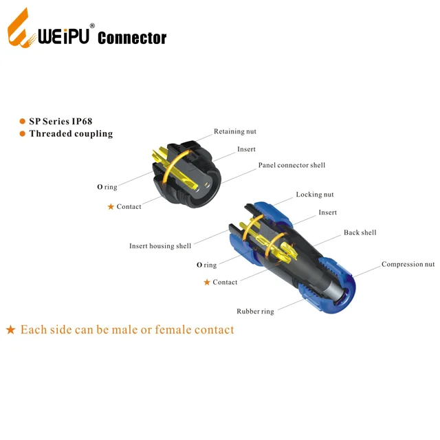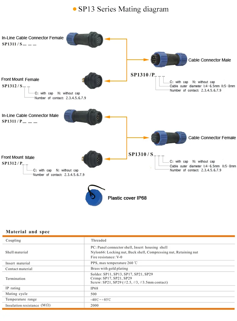 The SP13,SP17 and SP21 connectors are all IP68 connectors, threaded coupling. SP11 is the smallest plastic shell IP68 waterproof connector, this miniature connector is one of our most popular outdoor watertight connector.