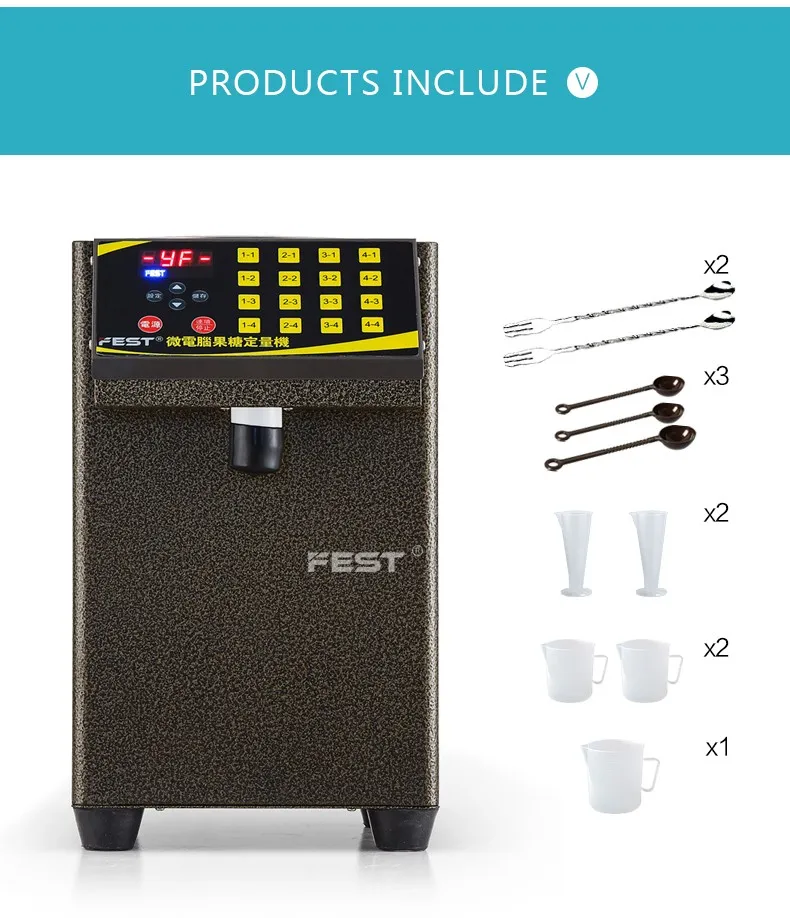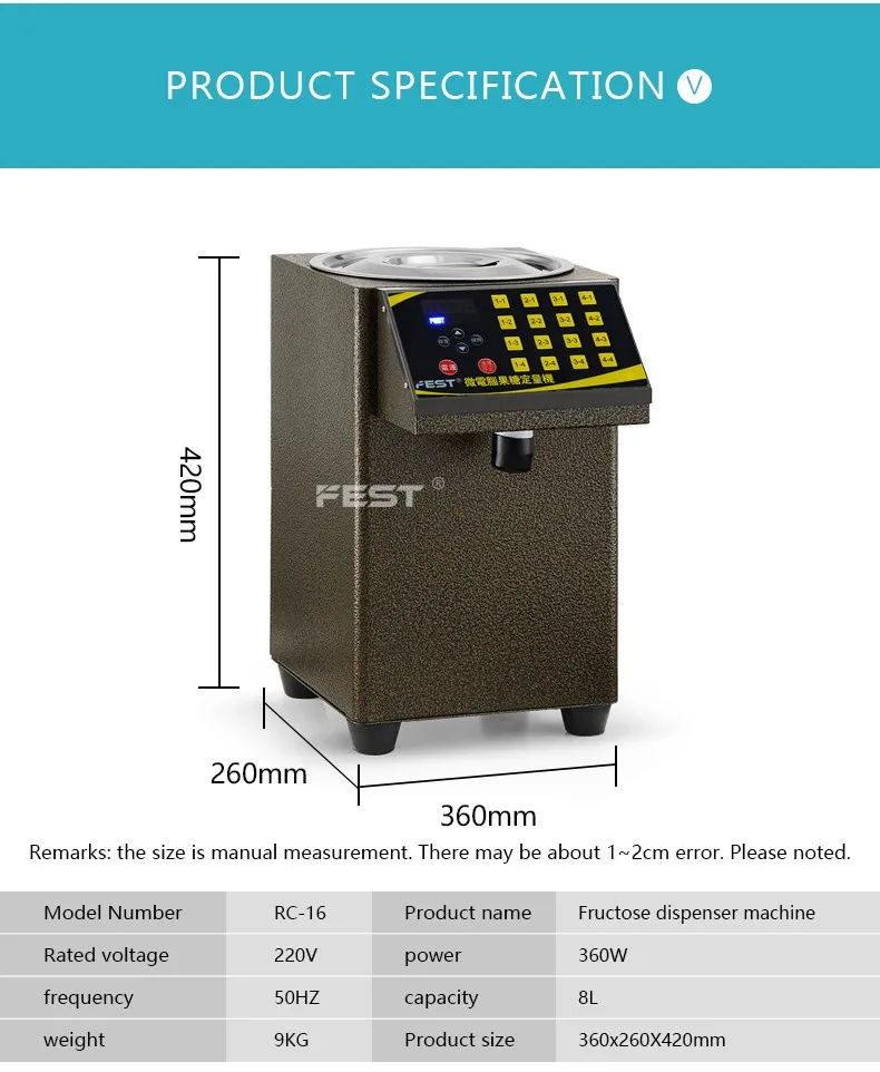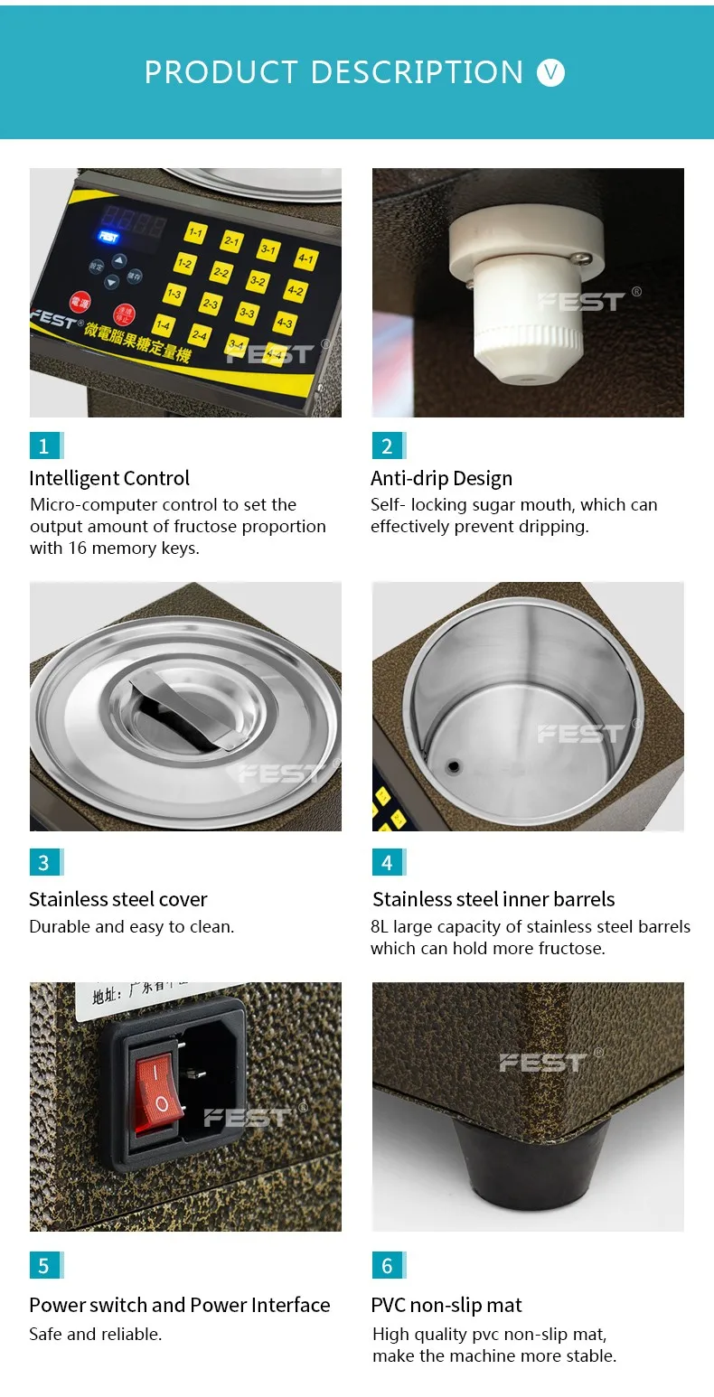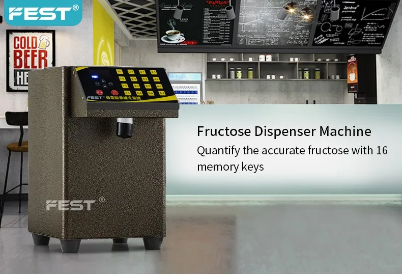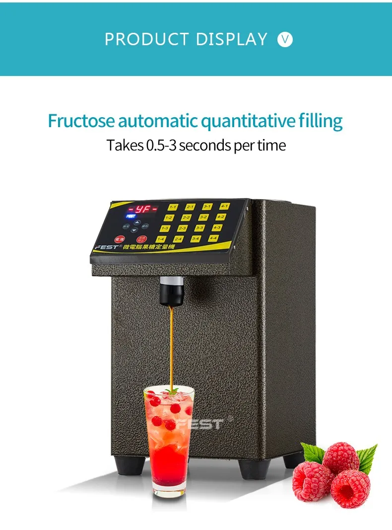 Fructose dispenser machine also called syrup dispensive, or fructose filling machine; It is an ideal equipment used to added quantitative fructose into milk tea to control the sweetness of milk tea in the appropriate range. It can make different sweet taste to satisfy the customer`s request. This kind of fructose dispensing machine adopts microcomputer control. It is easy to operate, durable to use.