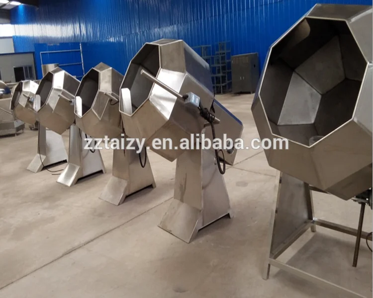 automatic seasoning machine: drum type seasoning machine is made of stainless steel. The potato chips (strips) are evenly turned during the rotation of the drum, and the seasonings are added by sprinkling or spraying. Seasoning is not easy to break.