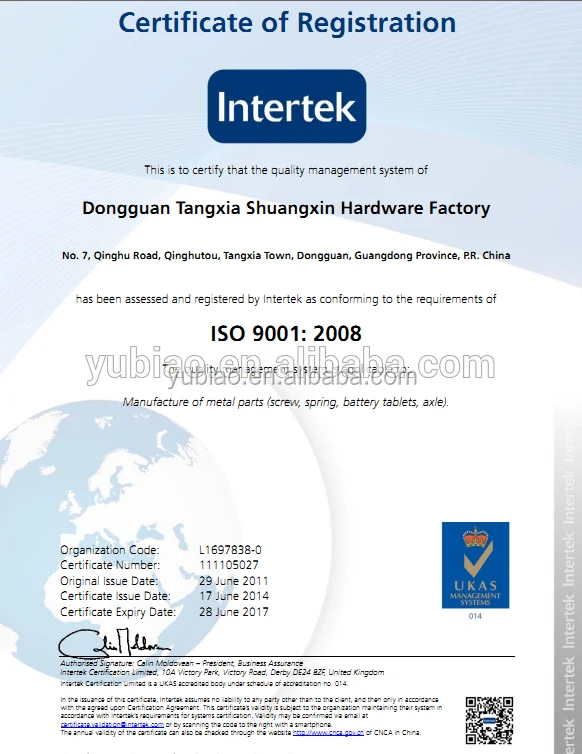 Dongguan Yubiao Hardware Co., Ltd( Also called Dongguan Tangxia Shuangxin Hardware Factory) was establish in the year of 2000. Specilized in the export of all kinds of high precision hardware parts,such as bolt,nut,hook,shaft,springs,wire clips,stamping parts,CNC milling/lathe parts and so on. Our products are widely used in lighting system,security system, bathroom accessory,plumbing fittings, furniture, electricity & electronics and so on.