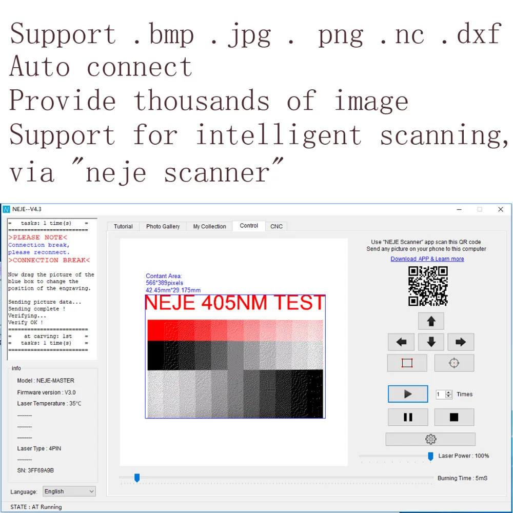 1. Full-featured: Directly execute .BMP, .JPG, .PNG files and "NEJE CLOUD" provides thousands of engraving materials and resources to download and keep updating
