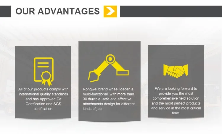 Rongwei brand wheel loader is multi-functional, with more than 30 durable, safe and effective attachments design for different kinds of job. We are looking forward to provide you the most comprehensive field solution and the most perfect products and service in the most critical time.