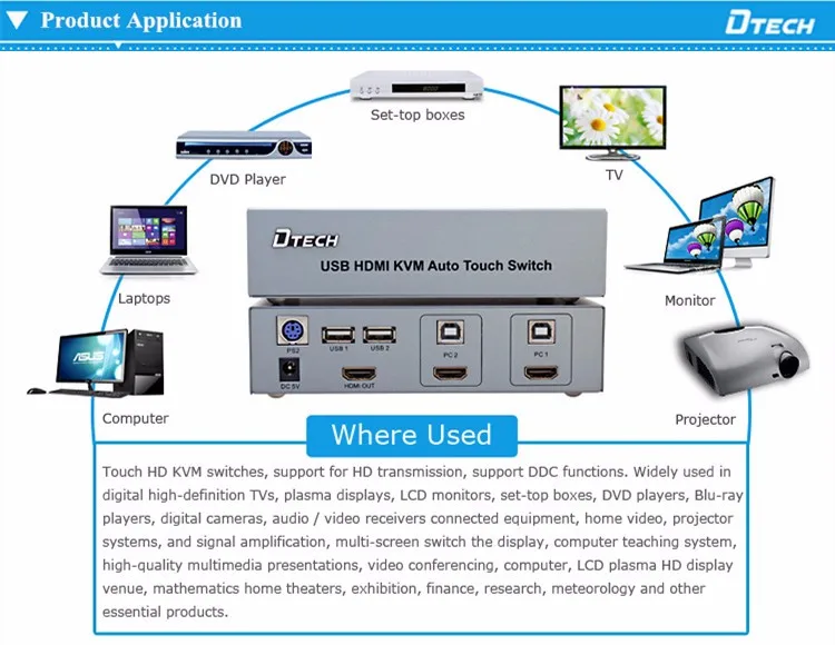 HD home application, HD retail display, large projector demonstration system, Bank & financial and security system, HD multi media advertising, HD signal distribution, large and medium audio&video conference system, big screen LED curtain wall display project, multi media teaching application, video surveillance & control systemFast switch 2 port kvm switch dvi hdmi keyboard mouse and monitor switch 2 to 1 USB/HDMI KVM switch