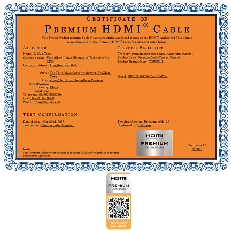 Jiehua (HDMI cable) is an Official HDMI Adopter Licensed by HDMI Licensing, LLC. You can find out our company on their official website.