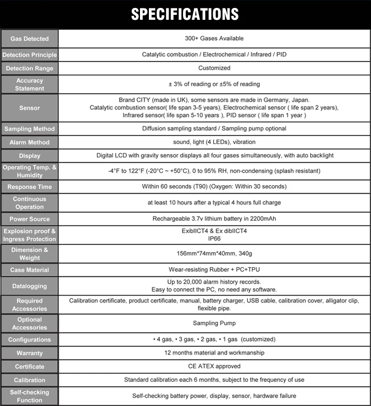 | Power supply: | Rechargeable Lithium Battery; | Detection principle: | Electrochemical & catalytic combustion & PID; |
