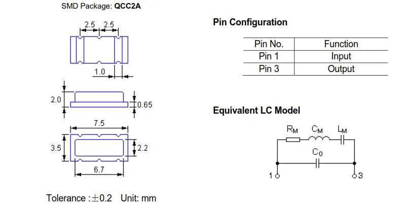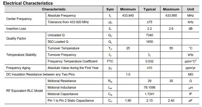 | Tolerance from 433.92MHz: | ±75KHz; | Size: | 7.5*3.5mm; |