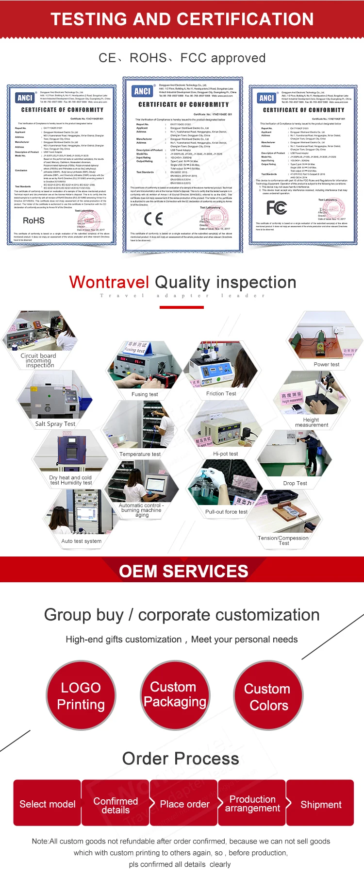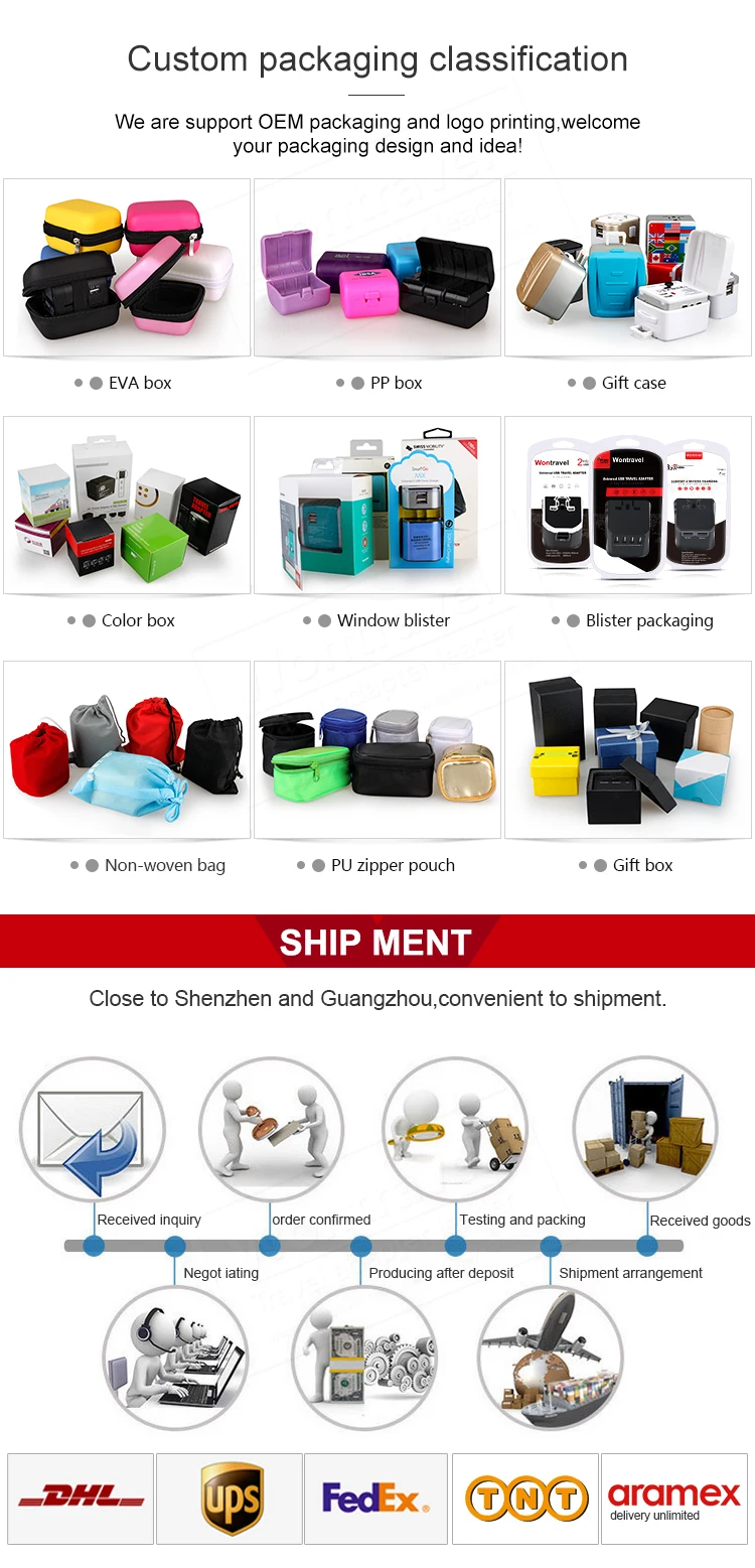 | Plug standard: | EU, UK, US, AU 4 Plug in one; | Package Type: | Package ways: white paper box, gift box, blister,pouch packing,PET box and Neutral kraft carton. And OEM is available. The logo can be printed as you need.; |