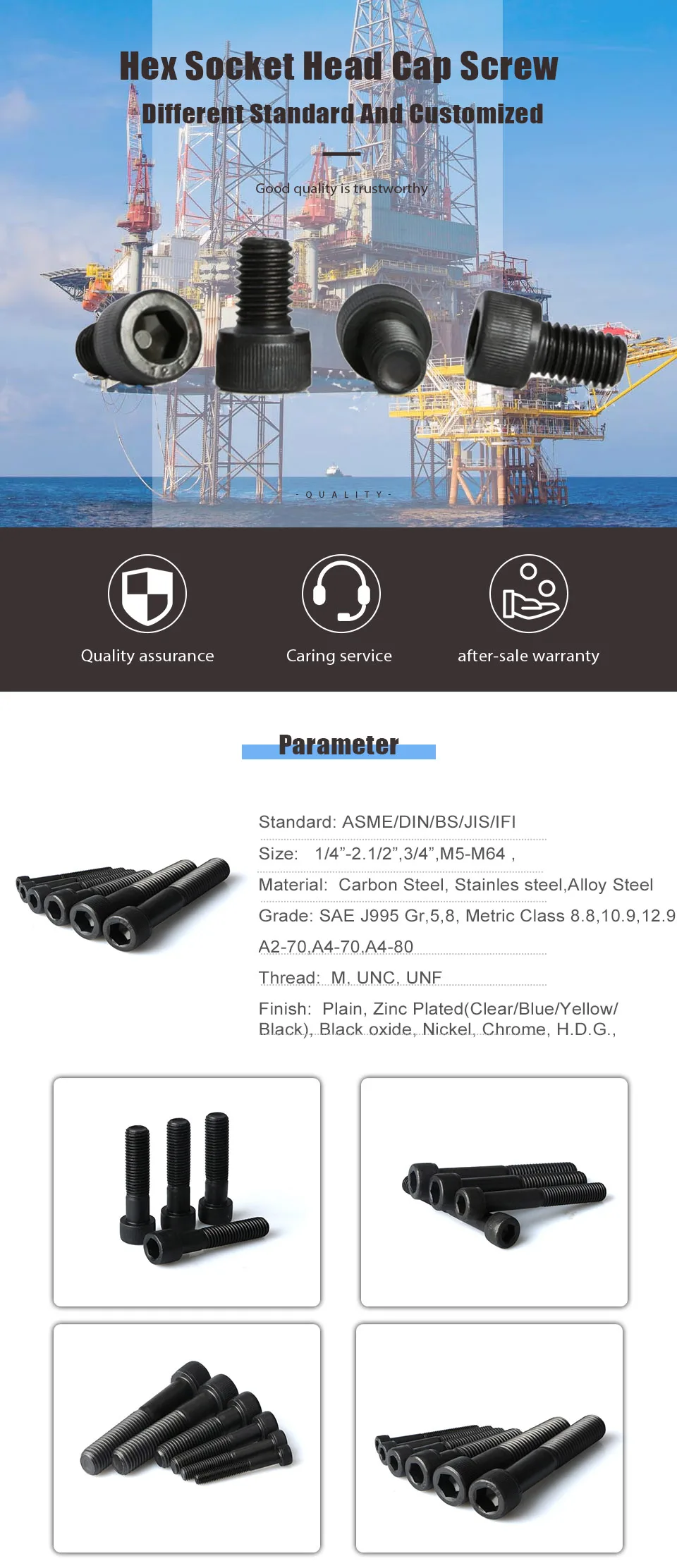 | Screws type: | Hex socket head screws M1.6-M10; | Packaging Detail: | 25kgs/carton and 36 cartons on standard export wooden pallets; |
