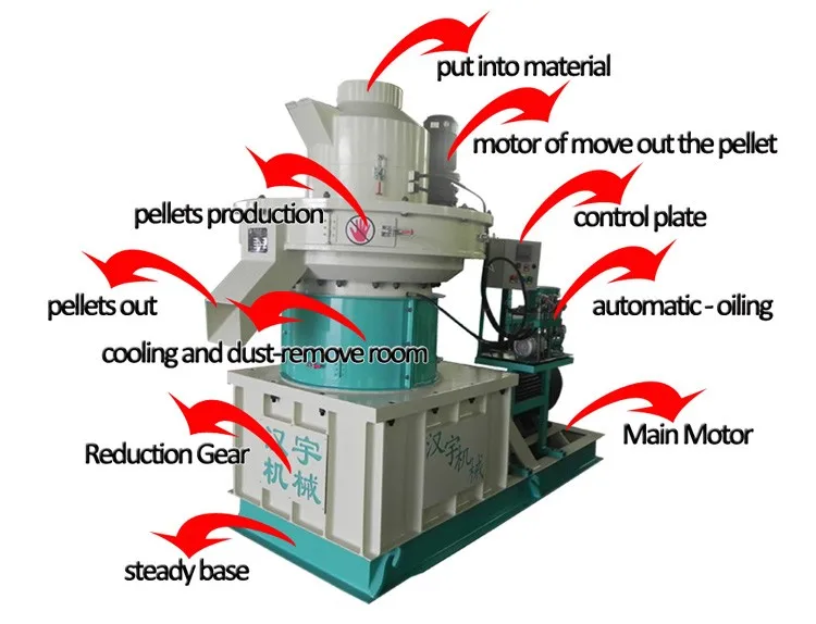 HYHM560 is a ring die wood sawdust pellet machine, its main motor power can reach 6 grade power of 90 kw, capacity per hour in 1000-1500 kg, pellets processing specifications in 6-30 mm, machine appearance size is 2200 mm, wide 1300 mm, height 3200 mm high, weight 6000 kg.