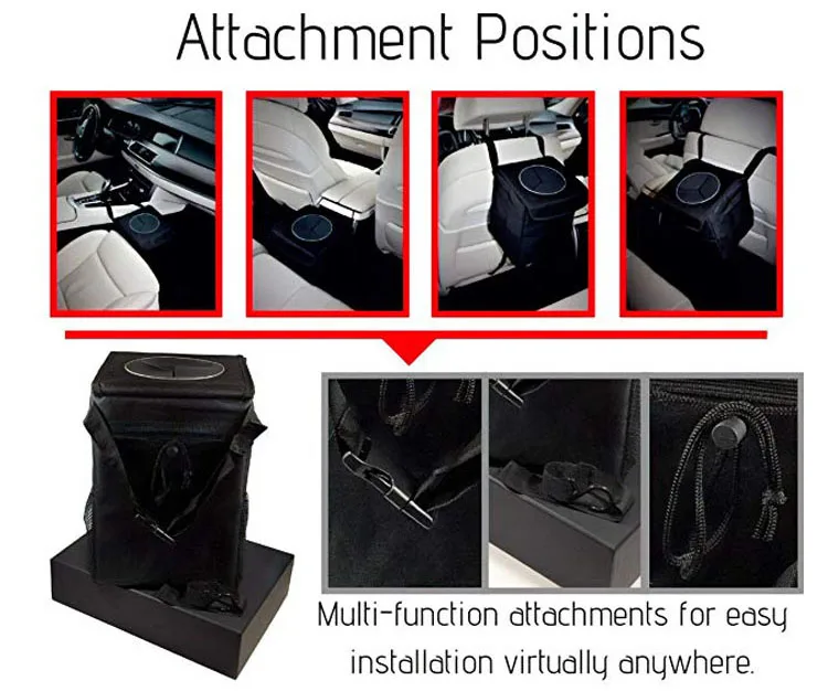 | Material: | Polyester; | Package Type: | Collapsible Heavy duty reinforced car garbage trash can storage bag with top rubber lid hole 1 pcs/poly bag individual package.; |