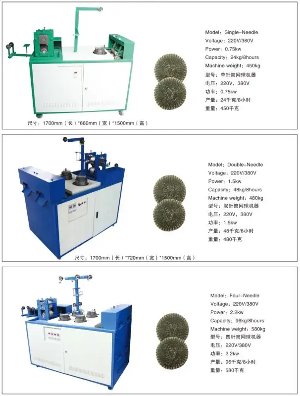 The cleaning ball machine has good compatibility, and can produce scourer with stainless steel wire, copper wire, iron wire and galvanized wire etc. The scourer machine is operated by 8 wires, treble scourers and single person in automation procedure such as wire feeding, forging pressing, planning and numerical control, etc. In a word, the whole machine has good harmonization of precision, excellent transmission, speed radio and control.