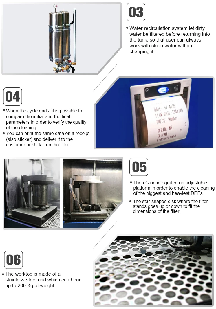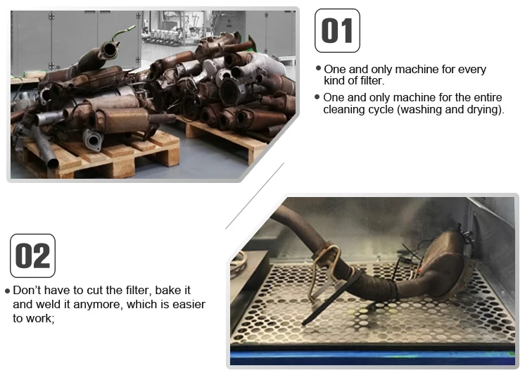 It can be used for different sized DPF, SCR, FAP an air filters of different industrial vehicles (buses, trucks, construction equipment, air conditioners and dust collectors) to completely remove PM10, cerium and oil deposits without damaging the filter.