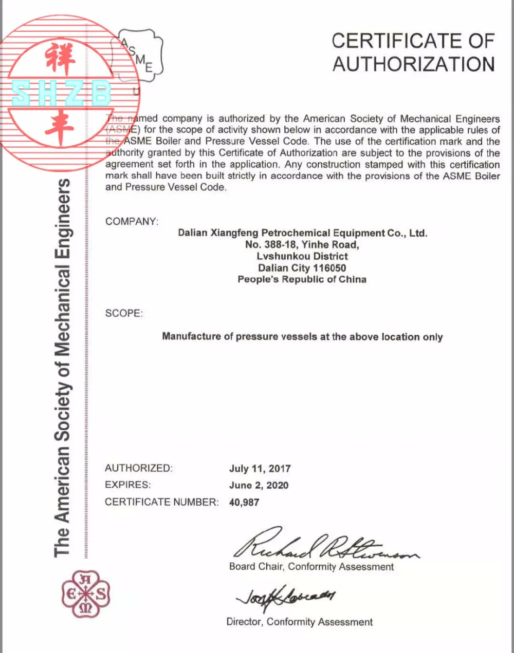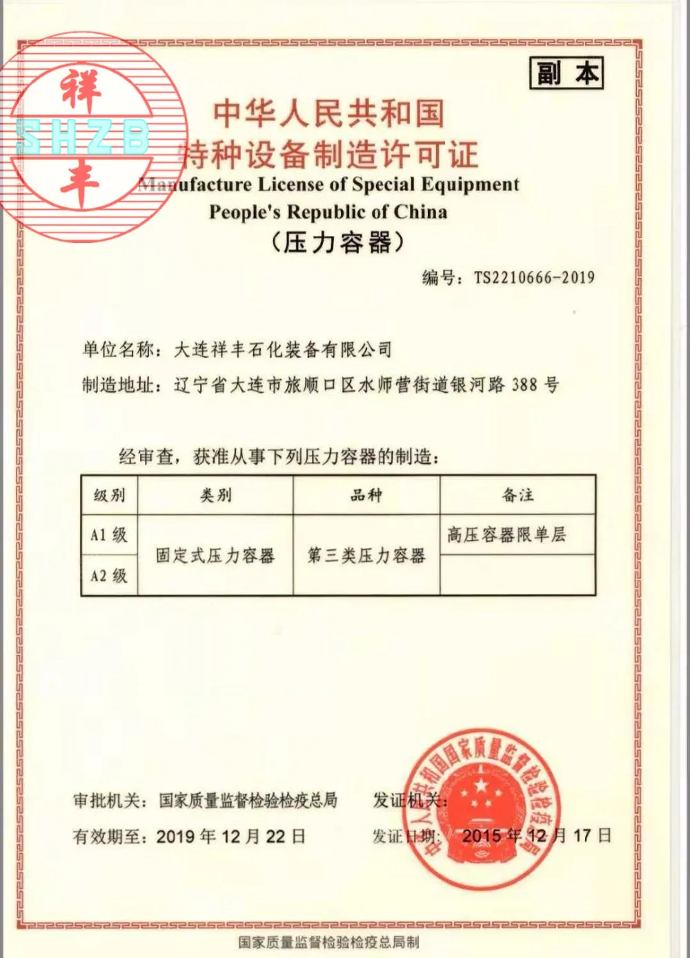 Dalian XiangFeng Petrochemical Equipment Company was established in 1978 and was reformed into limited company in 2005 with register capital RMB Ten Millions. XiangFeng has staff of 148, including 13 registered senior engineers, 15 certified welders, 2 physical-chemical experiment staff, 6 crane men, 6 electricians, 60 plumbers, 20 pressure vessels rivet workers, 17 pressure vessel certified welders, 8 ABS certified welders, 11 DNV certified welders, 7 nondestructive examination staff with RT, UT, PT, MT-II level qualification.