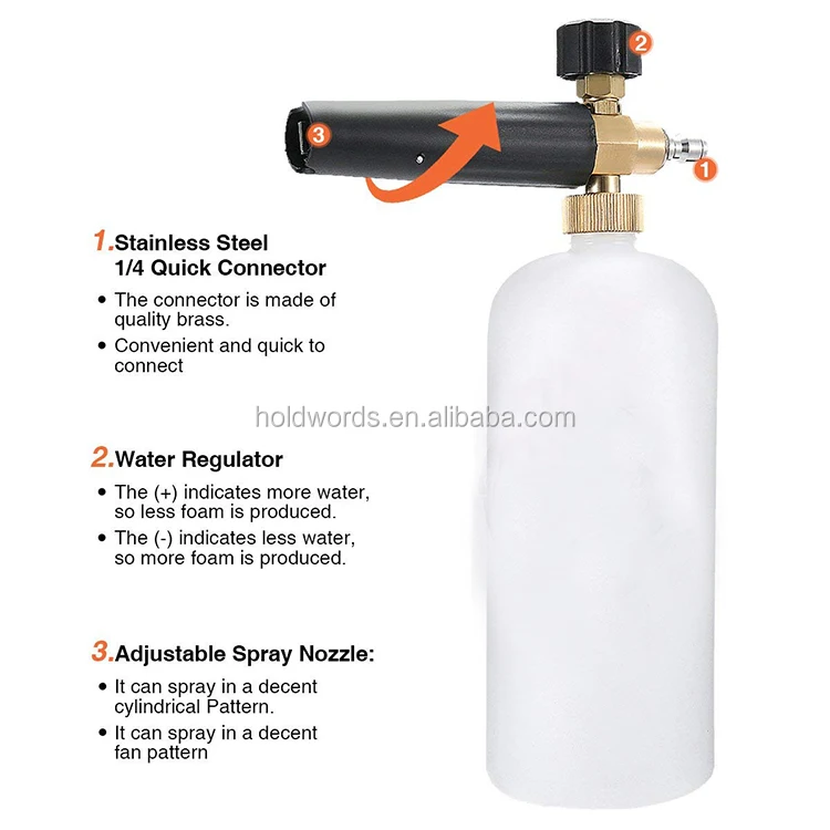| Washing System: | Water Spraying; | Packaging Detail: | adjustable Foam Cannon 1 Liter Bottle Snow Foam Lance With 1/4" Quick Connector Foam Blaster for Pressure Washer Gun; |