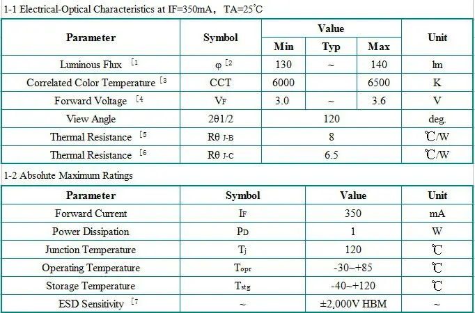Luminous Flux :160-170lm for 1w, 240-160lm for 3w