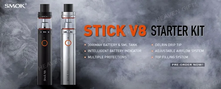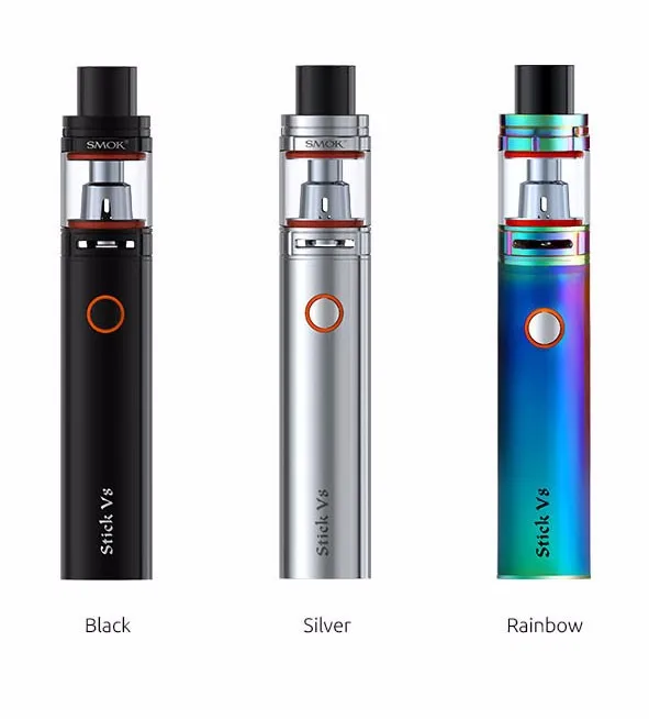 SMOK Stick V8 Kit is the latest pen style vaping device from SMOK, the battery has a 3000mAh super high capacity and 20amps continuous discharge capability, while its tank is the famous TFV8 big baby tank which is 5ml and shares all the baby beast coils. Moreover, intelligent battery indicator, adjustable airflow and top filling system will bring much convenience when using. The SMOK Stick V8 is a could beast for daily vaping. Black and Rainbow colors.
