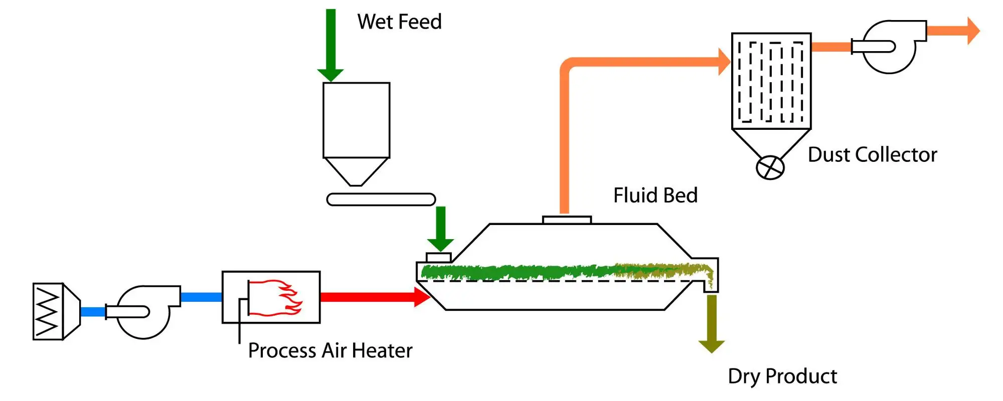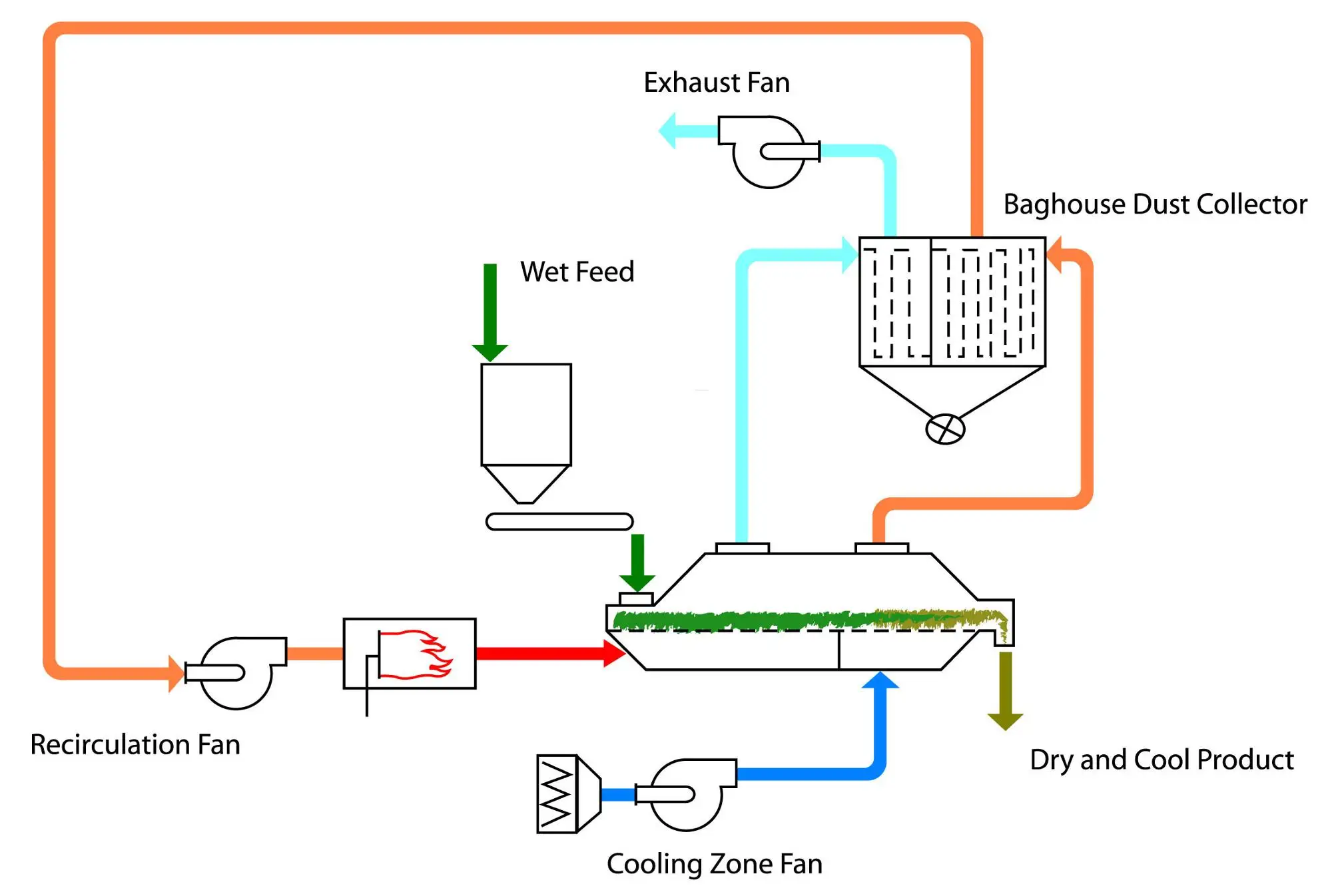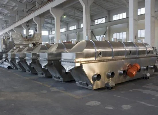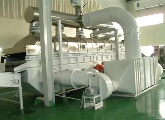 Raw material is feed into the machine from equipment inlet and move forward continuously along with the horizontal direction under vibratory power. The hot air passes through fluidized-bed and exchange with raw materials’damp, then the wet air is dusted by cyclone separator and exhausted from air outlet, the dried material is discharged through finished material outlet.