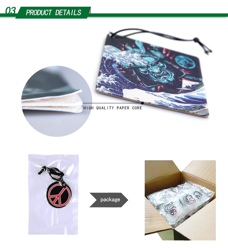 | Package Type: | custom design decorative hanging car air freshener paper card Single piece opp package; | Printing: | Digital printing; |