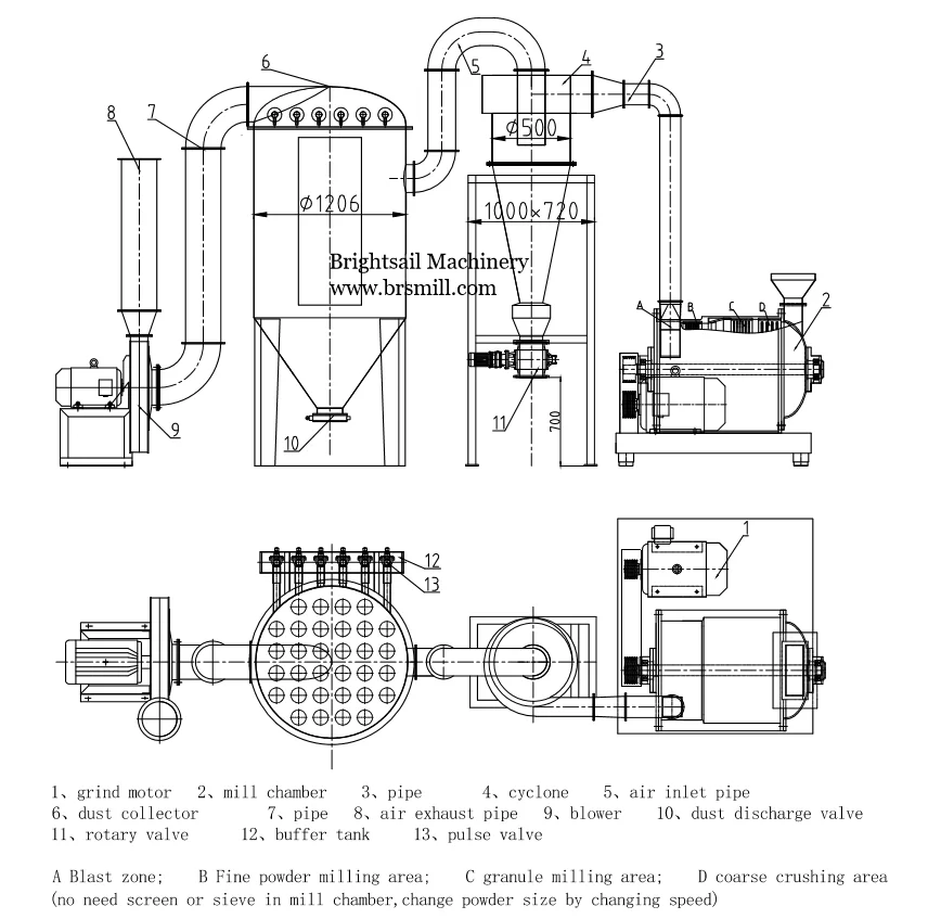 3) The mill part combines coarse crusher, middle fine mill and fine mill together, which means it can makes fine powder directly from big raw material, very effective.