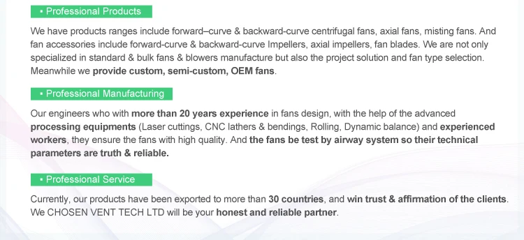 4. The impeller be test by completed build-up centrifugal fan, the air Performance Parameter is truth and reliable.