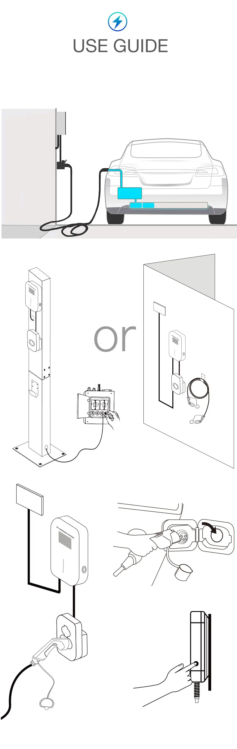 Products are sent to you with associated installation tools. You are able to install the charger indoor or outdoor. Firmly locking the charger on the installation backplane can prevent theft.