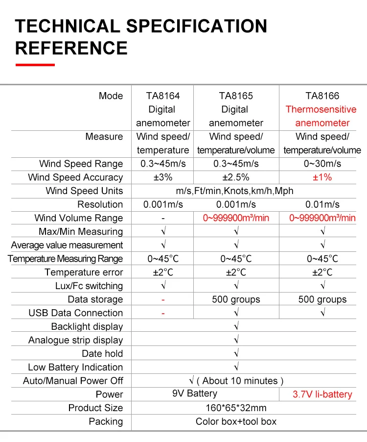 | Mode | TA8164 Digital anemometer | TA8165 Digital anemometer | TA8166 Thermosensitive anemometer |