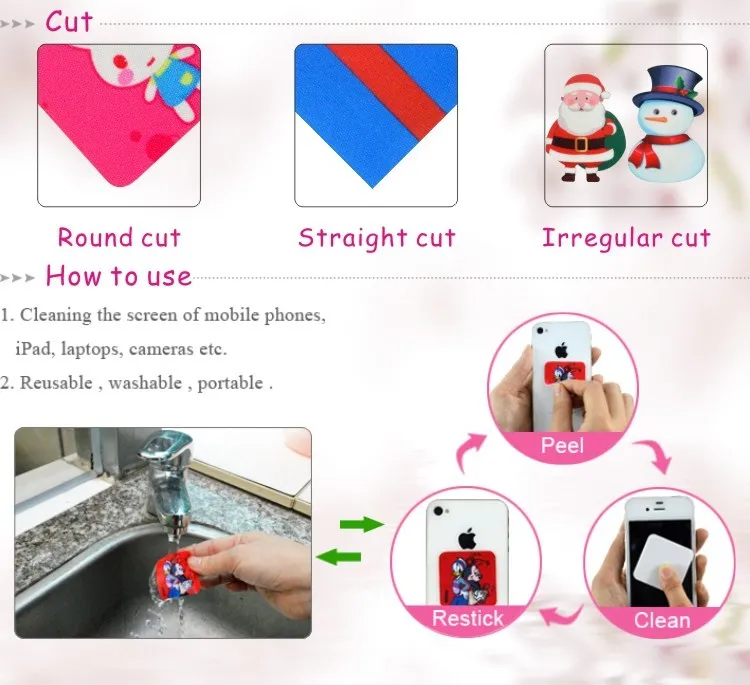 | Use: | Mobile Phone; | Name: | Hot selling custom shape microfiber sticky mobile phone screen cleaner; |