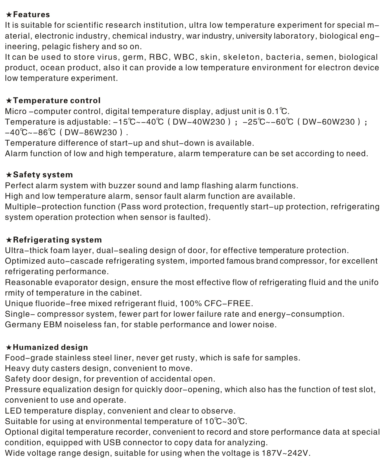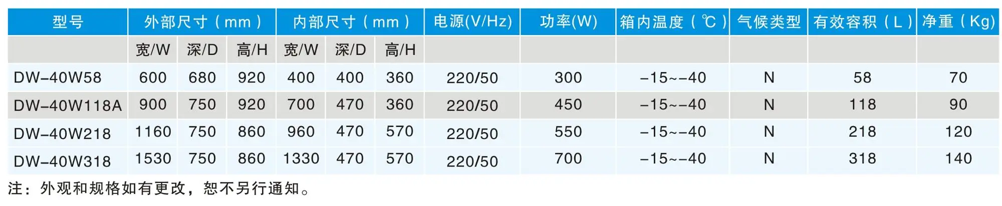 | DW-40W218 | 1160 | 750 | 860 | 960 | 470 | 570 | 220/50 | 550 | -15--40 | N | 218 | 120 |