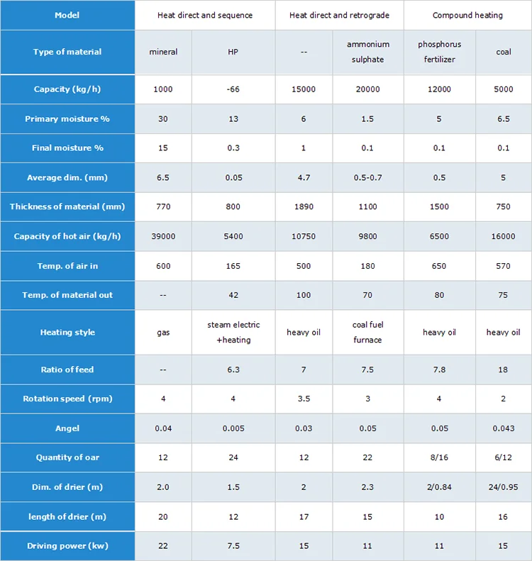 | Application 2: | Grown coal, coal slime, cement, mine, coal powder; | Application 1: | Chemical and cement, fertilizer, food, industries materials drying; |