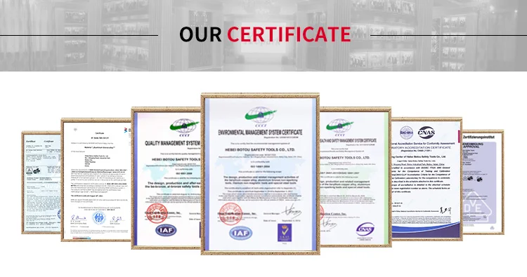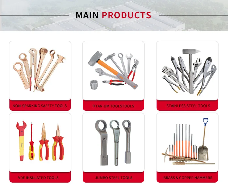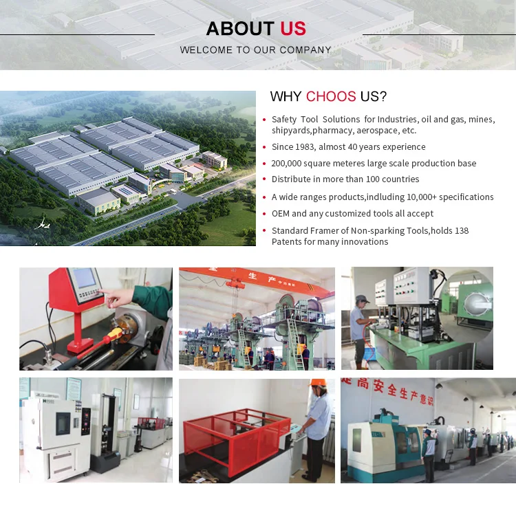 Our company established in 1983, lies in BOTOU city of China and hold registered capitals RMB80,000,000. It is specialized in manufacturing Non-sparking tools, Special steel tools, Titanium tools, Insulated tools and Stainless tools with 680 employeers, amoung 28 senior engineers and 396 personnel, and occupys 66,000 Square Meters, among 40,000 Square Meters buildings, and 480 sets advanced equipments which 98% are working well. We can produce 5000,000 pcs safety tools per year and 68% to be exported.It is the largest scale manufacturer worldwide Non-sparking tools safety tools