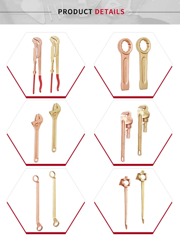 We have over 360 items,over 5600 specifications in Non-sparking tools,There is two kinds of material,Beryllium Copper alloy and Aluminium Bronze.And all productions are satisfied 100% under testing of JIS M7002-96 of japen and GB 10686-89 of China.There tools can aviod to rise sparking when tools strike,rubor collide with target in explosive atmosphere or flaammble vapours and widely uesd in oil and gas workings,petro-chemical plants,explosive manufactories ,mines,shipyards,pipeline construction,armed forces,pharmacy,airport and many others.