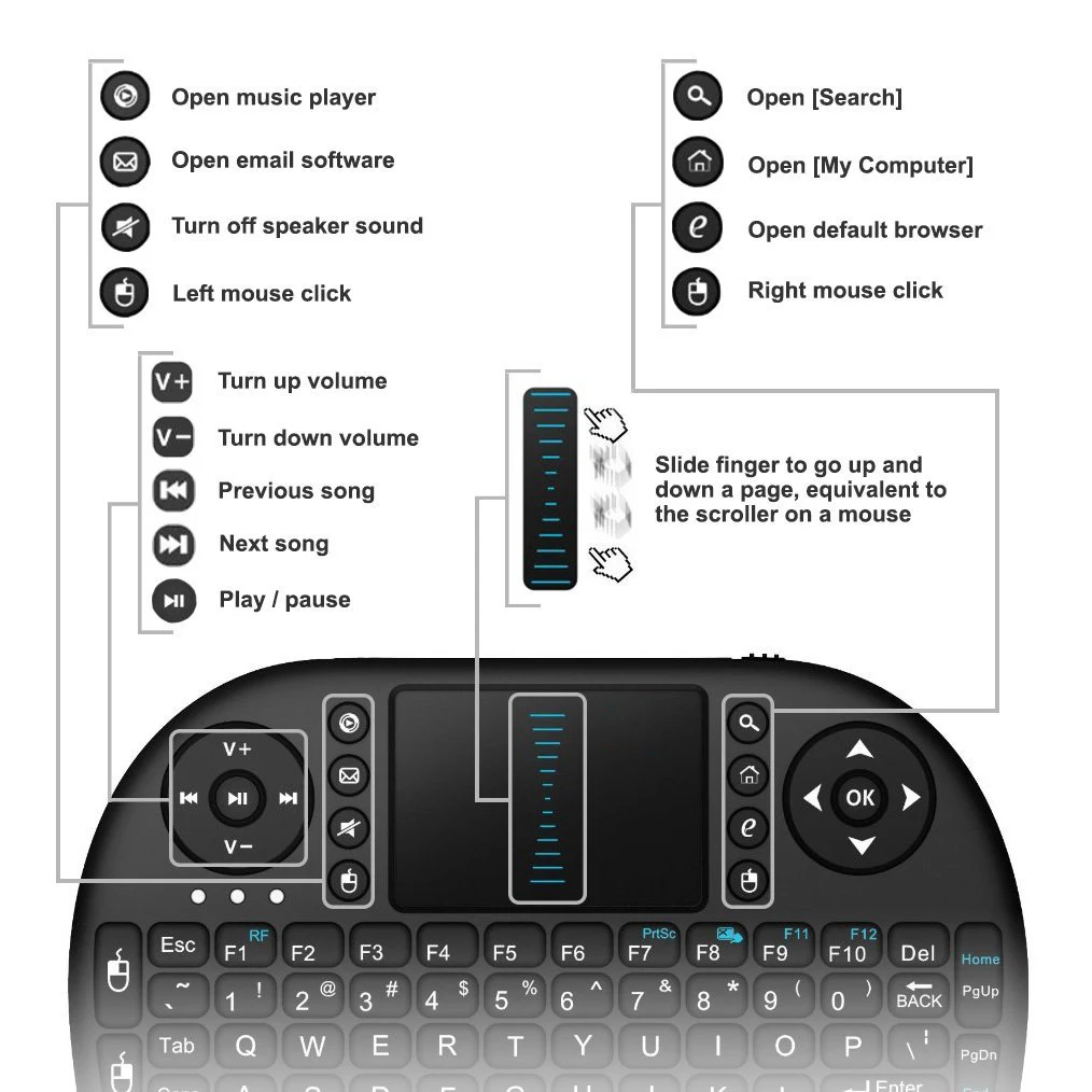 - Mini QWERTY 92-key keyboard multimedia control keys and PC gaming control keys