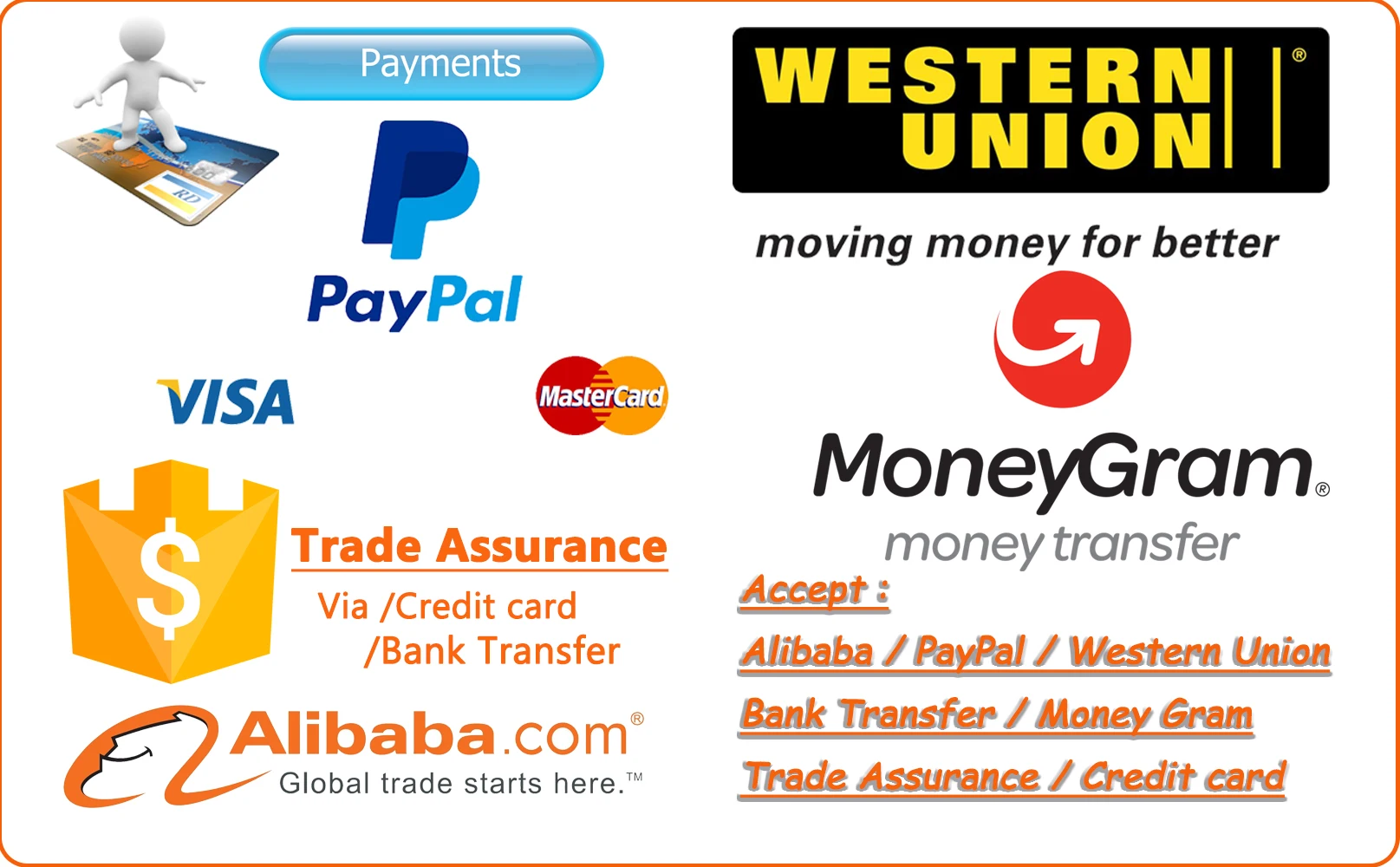We accept the payment through T/T. Paypal. Western Union And Trade Assurance on Alibaba.