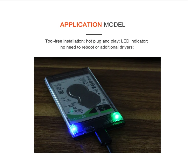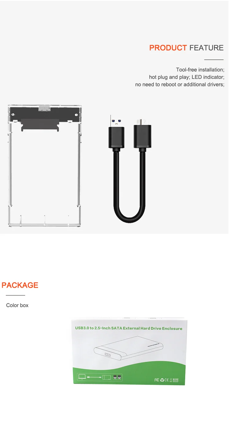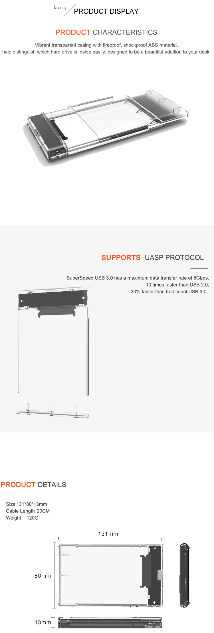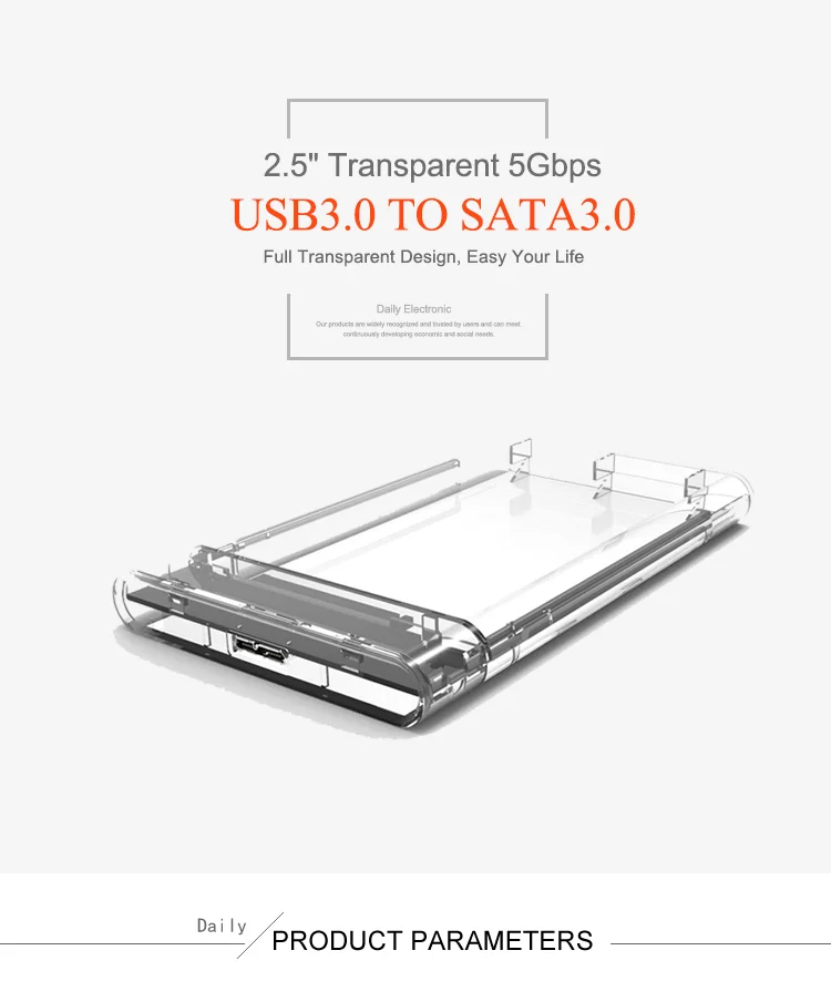 | Product Name | 2.5" Transparent 5Gbps USB3.0 to Sata3.0 HDD Case Tool Free Hard Drive Enclosure |
