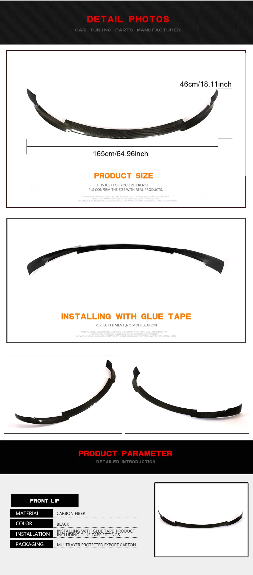 | Fitment: | Excellent; | Manufacturing Technique: | T Style Carbon Fiber Front Lip; |