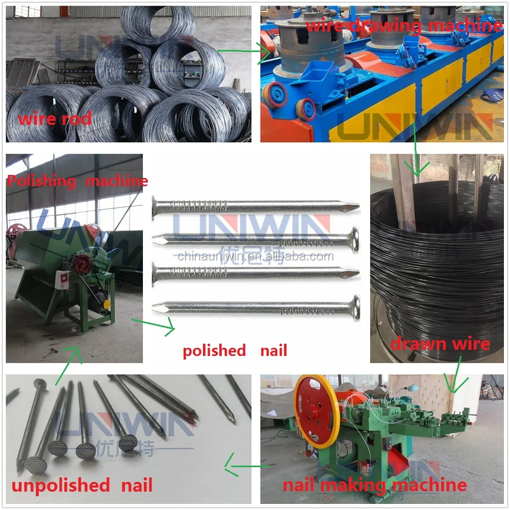 After the nail was finished from the wire iron nail making machine, the nail still is black, so need the polishing machine to make it bright and beautiful, in general, saw dust, oil or paraffin can as the polishing material, the cost is very low. this machine is based equipment of nail production.