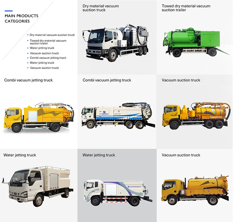 To unblock and clean sewer. To vacuum suck liquid waste and clean drainage well. Dry material vacuum suction truck suck and transport powder, coal in power plant, dust or cement.
