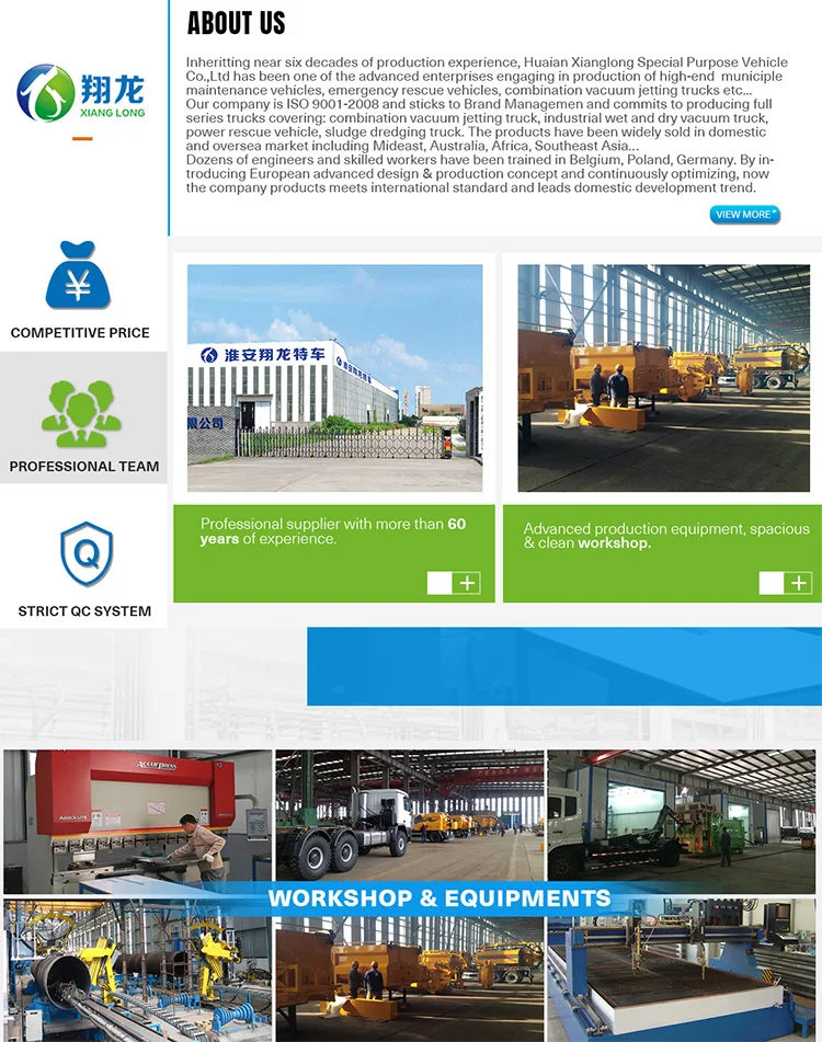 Inheritting near six decades of production experience, Huaian Xianglong Special Purpose Vehicle Co.,Ltd has been one of the advanced enterprises engaging in production of high-end municiple maintenance vehicles, emergency rescue vehicles, combination vacuum jetting trucks etc...