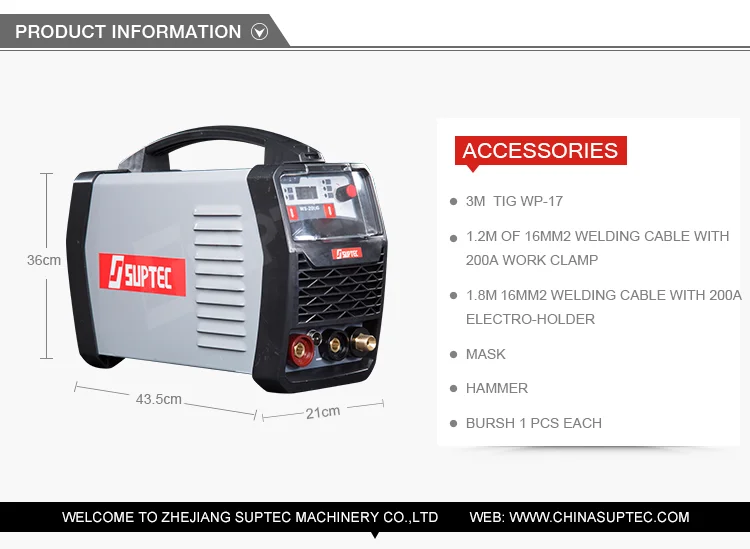Zhejiang Suptec Machinery Co., Ltd specialize in manufacturing all kinds of inverter welding machine inculding mma tig mig with ETL, CE, RoHS certification. We have experienced technician and professional engineers. 100% of our workers are well trained to guarantee the steady high quality of our machines.
