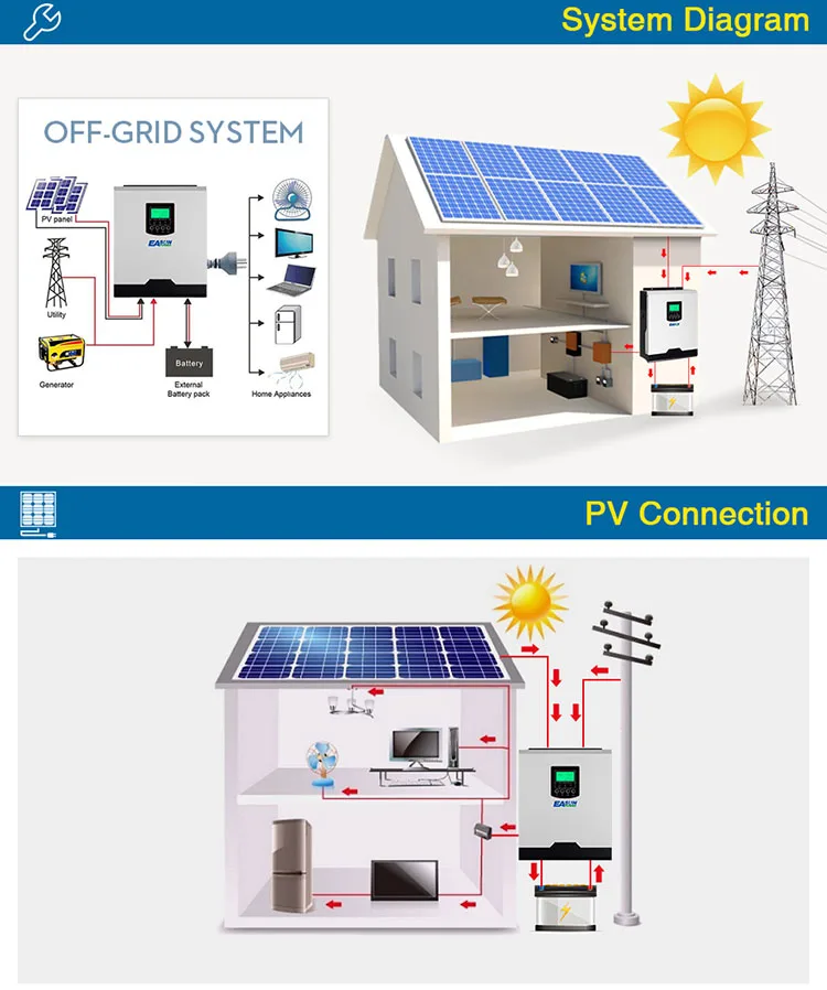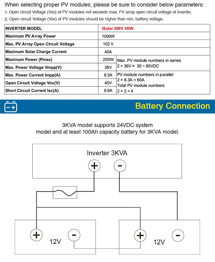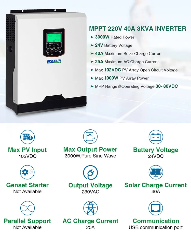 ISolar SMV 3KW is a new 3KVA 3000w 24Vdc Off Grid Solar Power Inverter MPPT Solar Inverter with 40A MPPT Solar Charger and 25A AC Charger