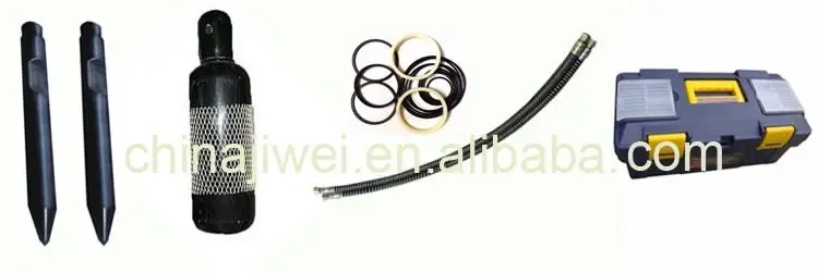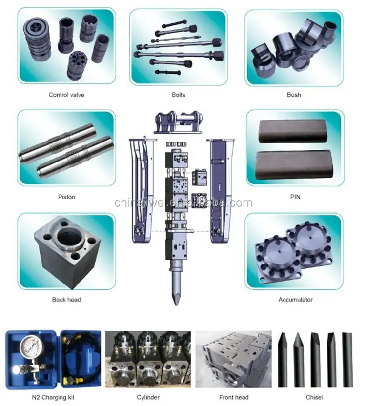 The standard spare parts: Two chisels, two hoses, one set of N2 charging kit with N2 bottle and pressure gauge, one set of spare seal kit, one tool box with necessary maintenance tools and operation manual as well.
