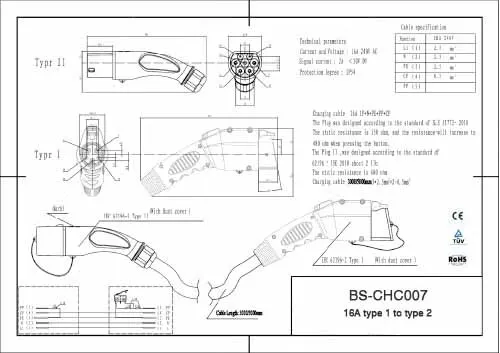 | Cable Length: | 3m, 5m, 7m; | Plug Standard: | IEC 62196-2 / SAE J1772; |