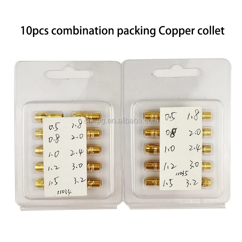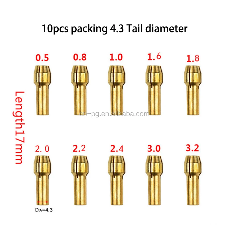| Package Type: | one set one blister, electric grinder three jaws copper clamping chuck 0.5-0.8-1.0-1.6-1.8-3.2 collet copper filling tail diameter of 4.8/4.3; | Single package size: | 10X8X2 cm; |