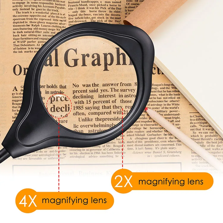 1. Optical lens: K9 optical hardening treatment glass lens with 2 magnification. Not easy to scratch and deform. You will not feel dizzy even if use long time for reading.