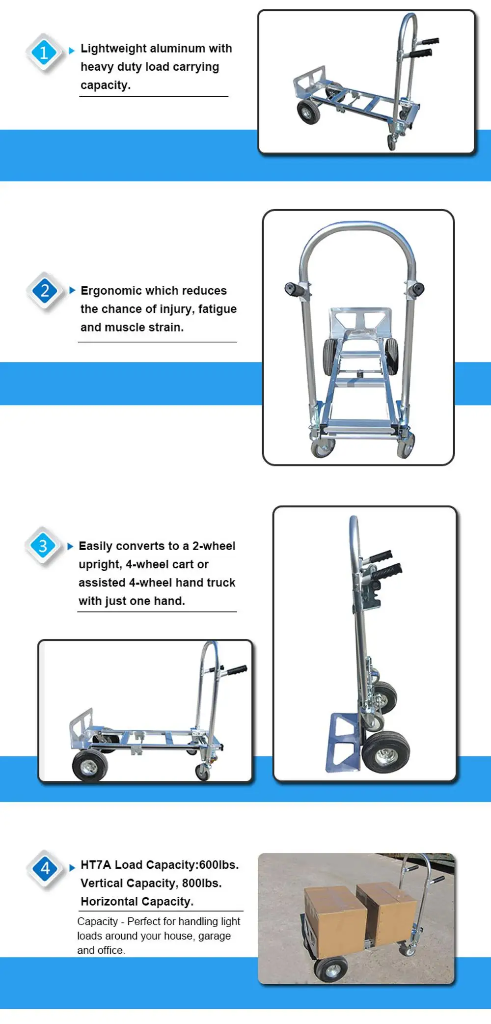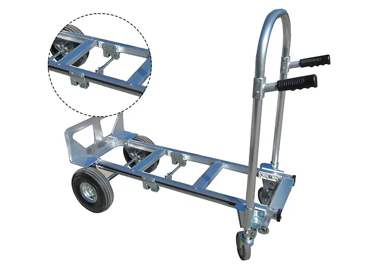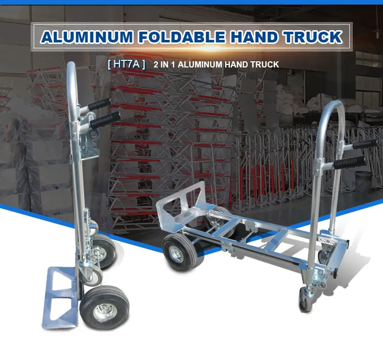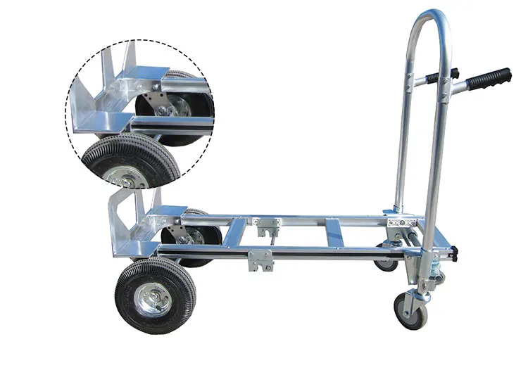 This is a 2 in 1 Aluminum Hand Truck. This aluminum hand truck easily folds from the hand truck position to the utility cart position. No tools needed to switch between positions. Just press a lever unlocking the two small moveable wheels, and this is now a aluminum utility cart.