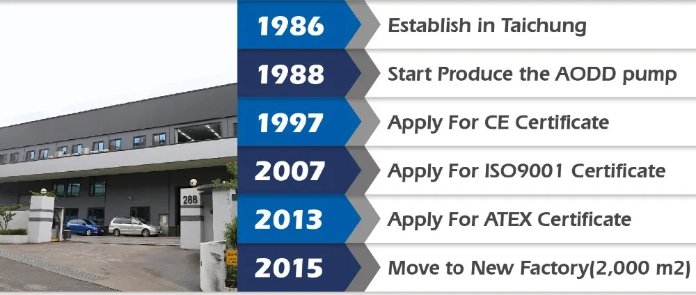 We are a professional manufacturer of air-operated double diaphragm pump (AODD) in Taiwan. Now we have CE and ISO9001 certifications. Our pumps have passed many tests and got customer's trust in Japan, Italy, Spain, Brazil, India and South Africa for over 5 years. We are devoted to developing a greater variety of pumps in the near future.