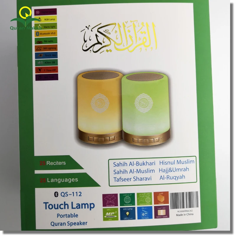 Moddel: | QS112 | Quran Speaker&Table Lamp (8G) with BT5.0 *High performance audio output 5W loud speaker *Quran Audio(18 voices), Translation (12 languages). |