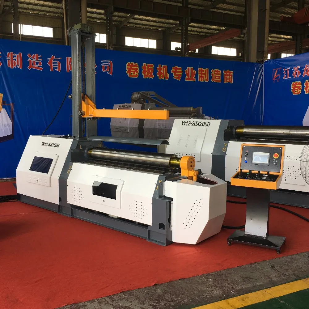 W12-series CNC Four-roller bending machine with international advanced technology, controlled by PLC programmable numerically, all hydraulic driving, it's a heavy duty CNC rolling machine which can come true automatic bending, also it's the nesy equipment for bending multi section curved, square, round, conical and other special shape working piece. With our four roller plate bending machine,plate can be bent on both side without return. The flat edge is 1.5-2 times of the thickness.