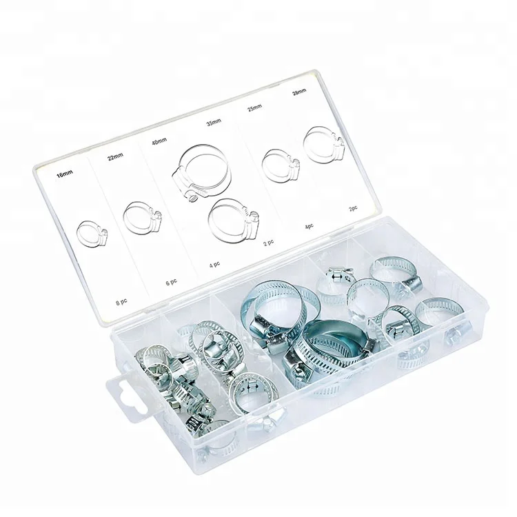 26pc hose clamp assortment,which can be used for different place.Packing in one plastic box that is good for sale in supermarket.The size can be found in the color card attached in the box.The goods is wide used in the factory and home.