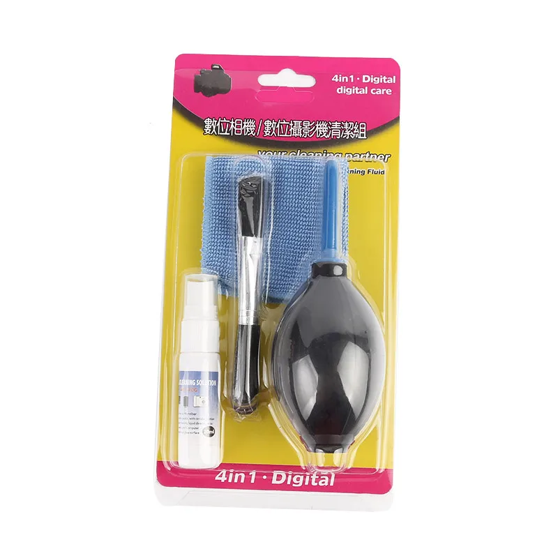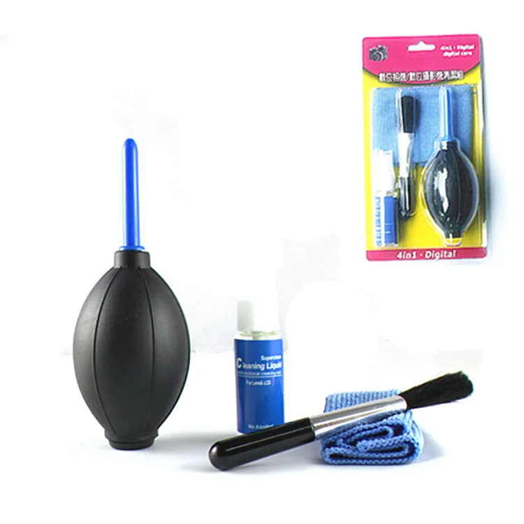 4 in 1 for DSLR camera cleaning kit combined by dust blower,cleanin cloth,cleaning liquid and cleaning brush.